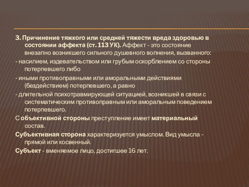 Слайд 253. Причинение тяжкого или средней тяжести вреда здоровью в состоянии аффекта