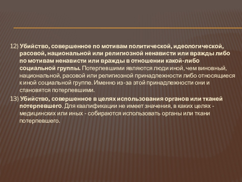 Слайд 1212) Убийство, совершенное по мотивам политической, идеологической, расовой, национальной или религиозной