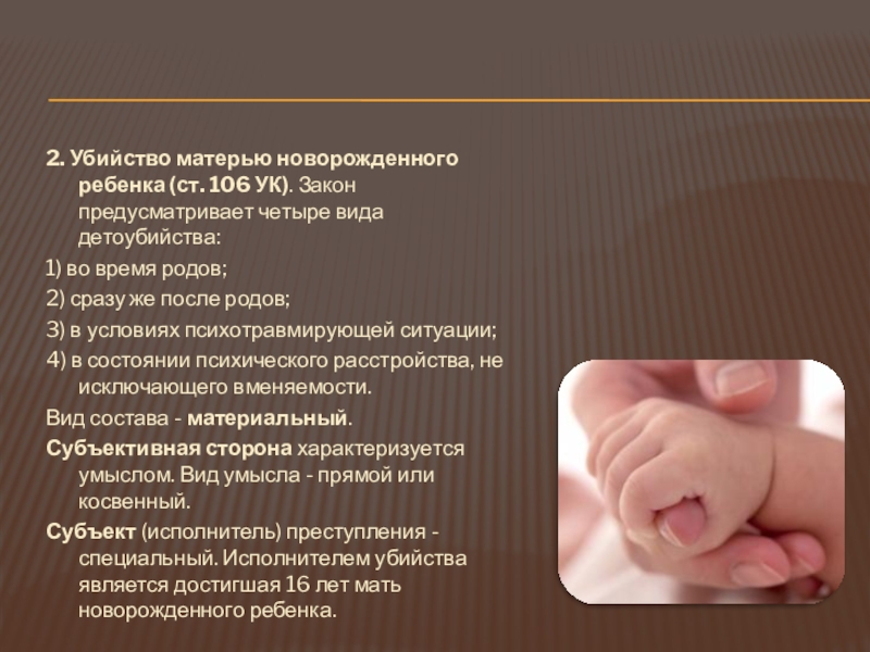 Слайд 132. Убийство матерью новорожденного ребенка (ст. 106 УК). Закон предусматривает четыре
