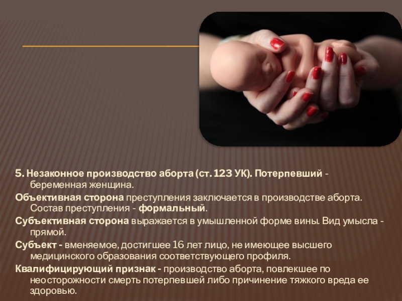 Слайд 365. Незаконное производство аборта (ст. 123 УК). Потерпевший - беременная женщина.