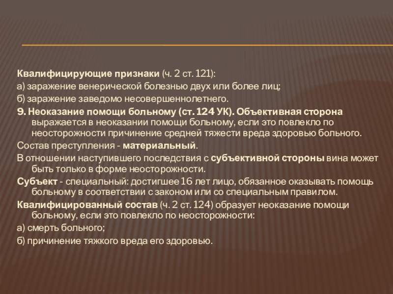 8. Заражение венерической болезнью (ст. 121 УК). Объективная сторона преступления характеризуется заражением другого лица венерической болезнью.
