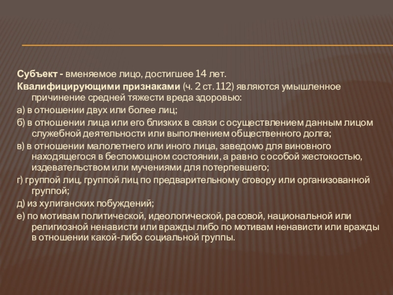 Слайд 31Квалифицирующие признаки (ч. 2 ст. 121):