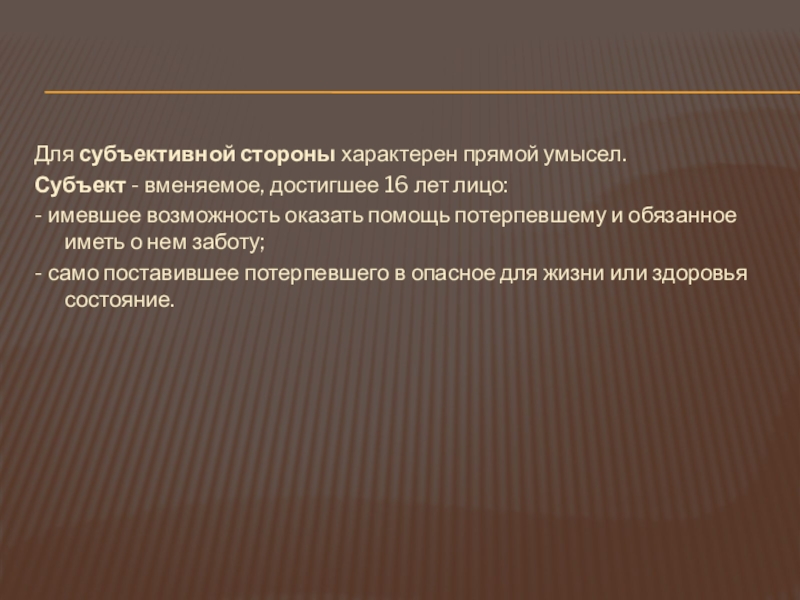 Субъект - специальный: достигшее 16 лет лицо, обязанное оказывать помощь больному в соответствии с законом или со специальным правилом.