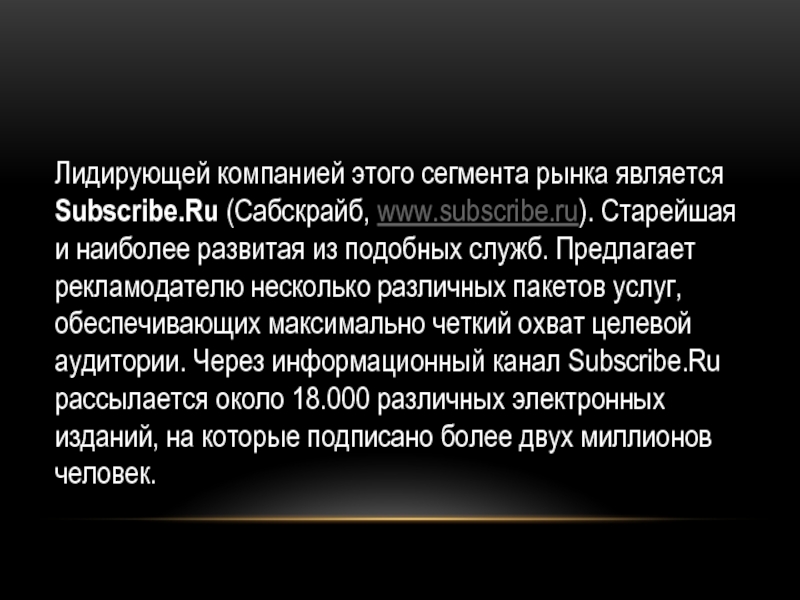 Слайд 5Лидирующей компанией этого сегмента рынка является Subscribe.Ru (Сабскрайб, www.subscribe.ru). Старейшая и наиболее