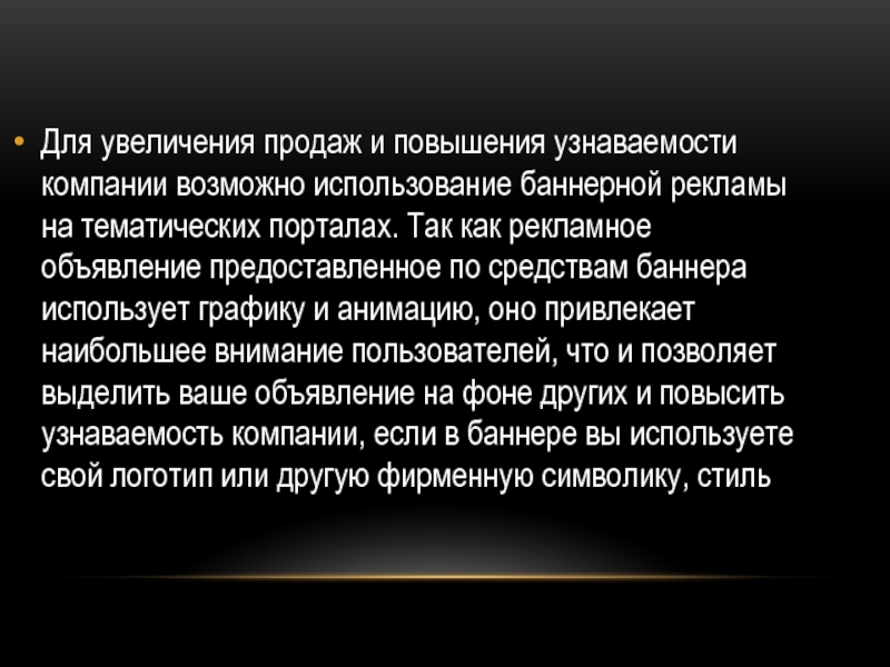Слайд 9Для увеличения продаж и повышения узнаваемости компании возможно использование баннерной рекламы
