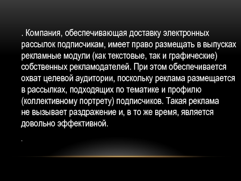 Слайд 4. Компания, обеспечивающая доставку электронных рассылок подписчикам, имеет право размещать в выпусках