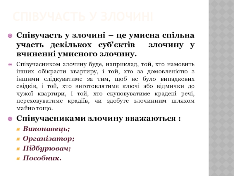 Слайд 7СПІВУЧАСТЬ У ЗЛОЧИНІ