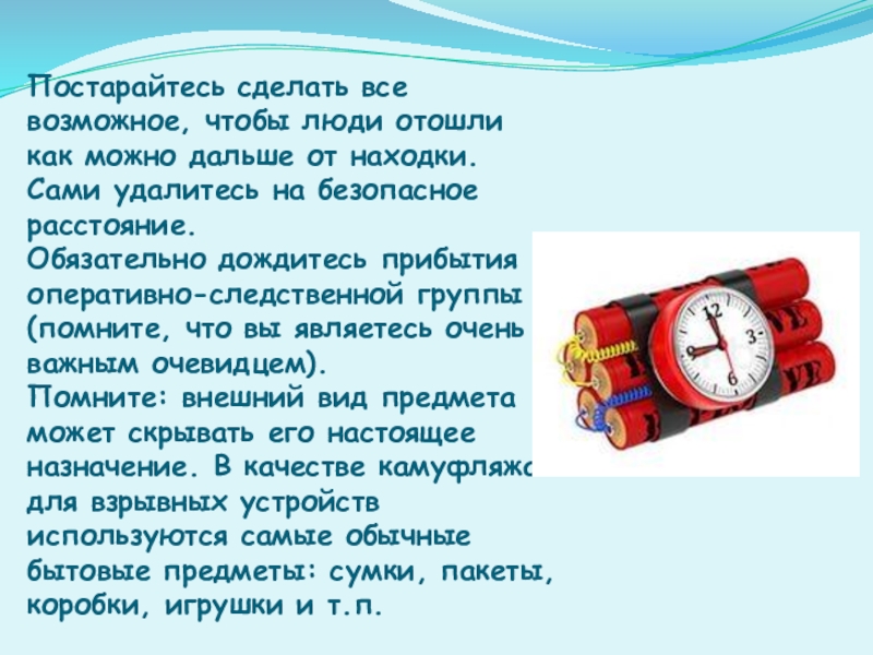 Помните: внешний вид предмета может скрывать его настоящее назначение. В качестве камуфляжа для взрывных устройств используются самые обычные бытовые предметы: сумки, пакеты, коробки, игрушки и т.п.
