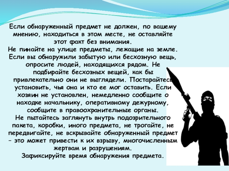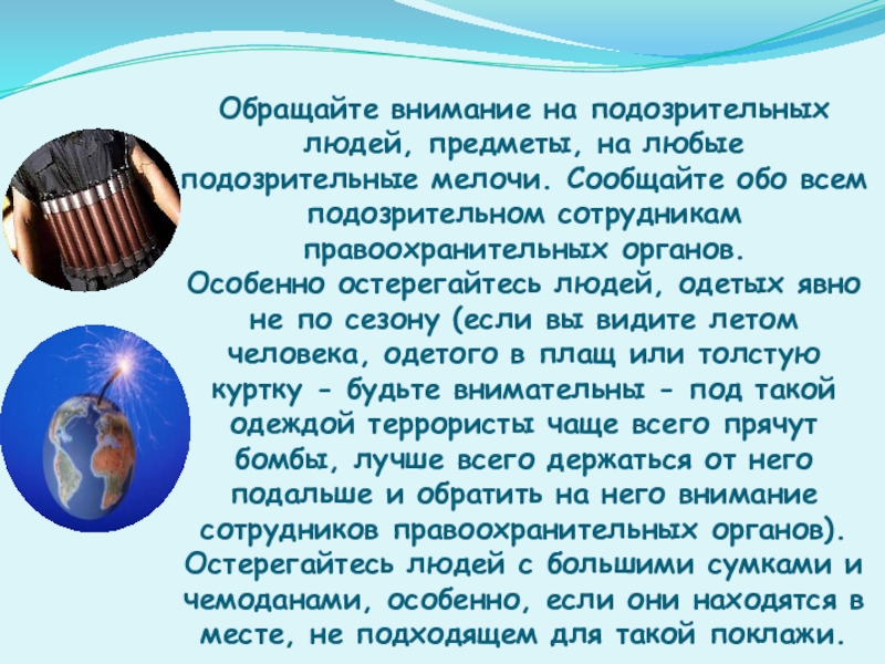Слайд 3Обращайте внимание на подозрительных людей, предметы, на любые подозрительные мелочи. Сообщайте