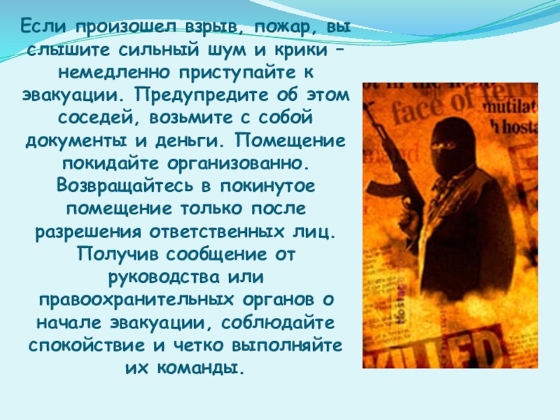 Слайд 4Если произошел взрыв, пожар, вы слышите сильный шум и крики –