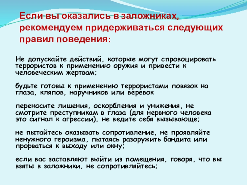 Слайд 11Если вы оказались в заложниках, рекомендуем придерживаться следующих правил поведения: