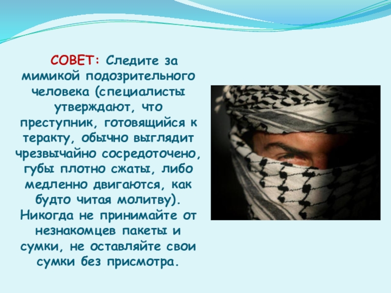 готовящийся к теракту, обычно выглядит чрезвычайно сосредоточено, губы плотно сжаты, либо медленно двигаются, как будто читая молитву). Никогда не принимайте от незнакомцев пакеты и сумки, не оставляйте свои сумки без присмотра.