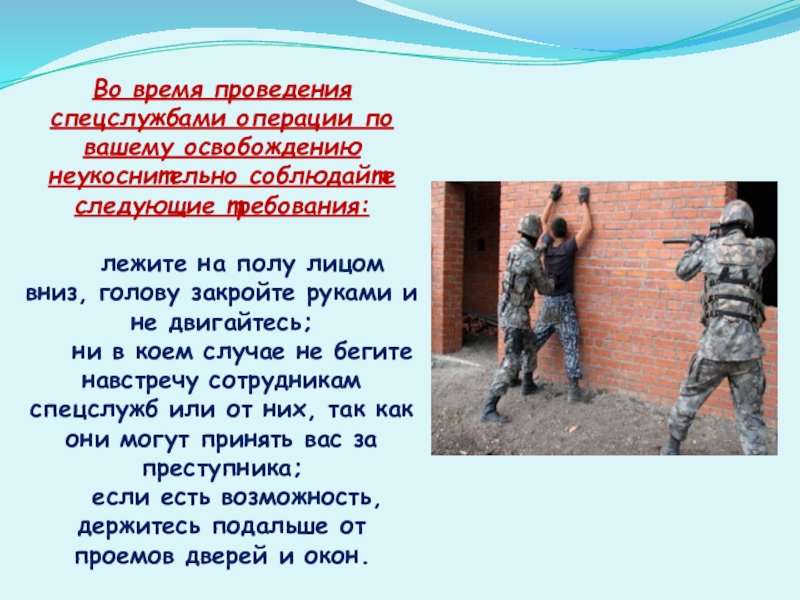 Слайд 13Во время проведения спецслужбами операции по вашему освобождению неукоснительно соблюдайте следующие