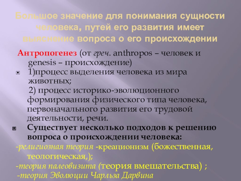 Существует несколько подходов к решению вопроса о происхождении человека: