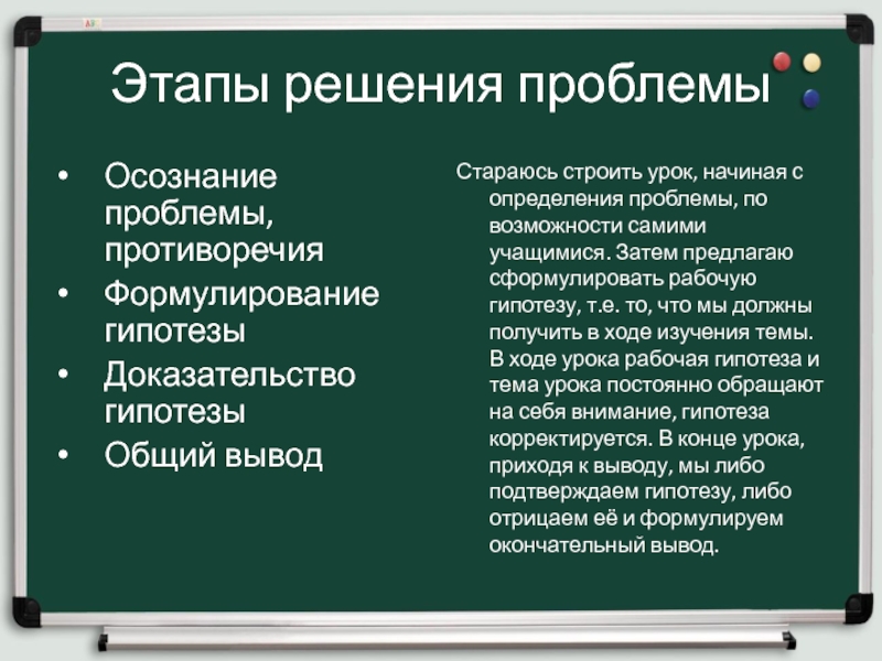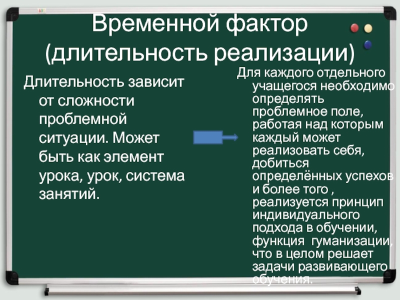 Для каждого отдельного учащегося необходимо определять проблемное поле, работая над которым каждый может реализовать себя, добиться определённых успехов и более того , реализуется принцип индивидуального подхода в обучении, функция гуманизации, что в целом решает задачи развивающего обучения.
