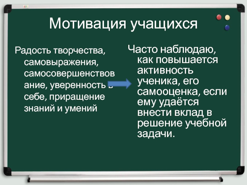 Часто наблюдаю, как повышается активность ученика, его самооценка, если ему удаётся внести вклад в решение учебной задачи.