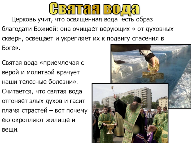 Святая вода «приемлемая с верой и молитвой врачует наши телесные болезни». Считается, что святая вода отгоняет злых духов и гасит пламя страстей – вот почему ею окропляют жилище и вещи.