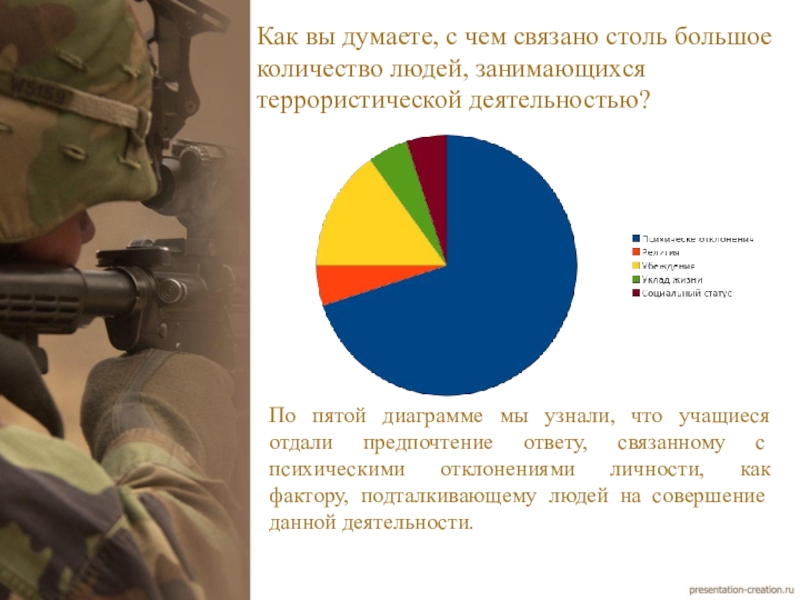 По пятой диаграмме мы узнали, что учащиеся отдали предпочтение ответу, связанному с психическими отклонениями личности, как фактору, подталкивающему людей на совершение данной деятельности.