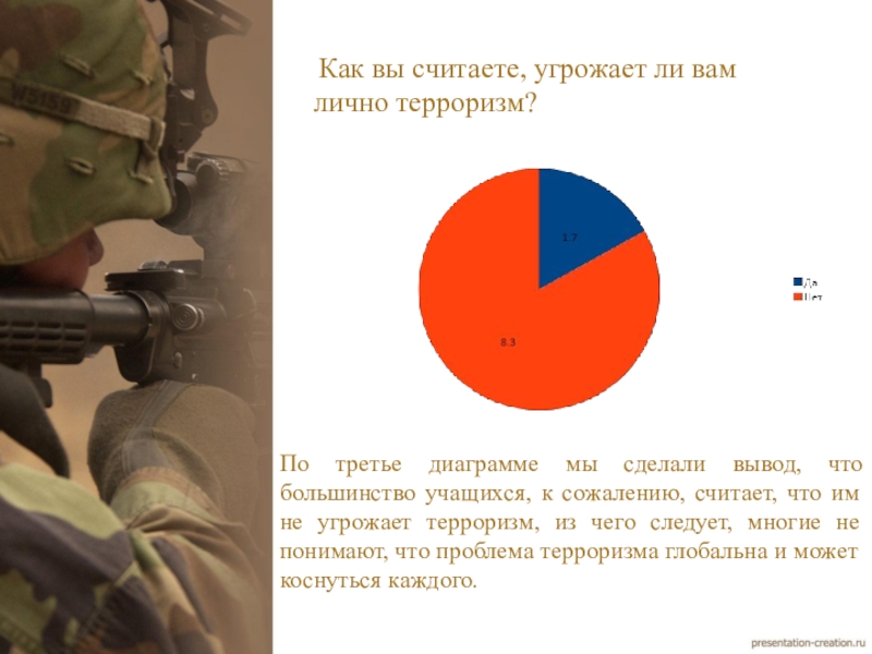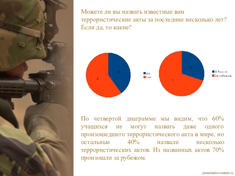 По четвертой диаграмме мы видим, что 60% учащихся не могут назвать даже одного произошедшего террористического акта в мире, но остальные 40% назвали несколько террористических актов. Из названных актов 70% произошли за рубежом.