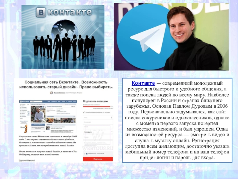 Это сайт презентаций, где можно хранить и обмениваться своими презентациями, докладами, проектами, шаблонами в формате PowerPoint с другими пользователями. Мы помогаем школьникам, студентам, учителям, преподавателям хранить и обмениваться учебными материалами.
