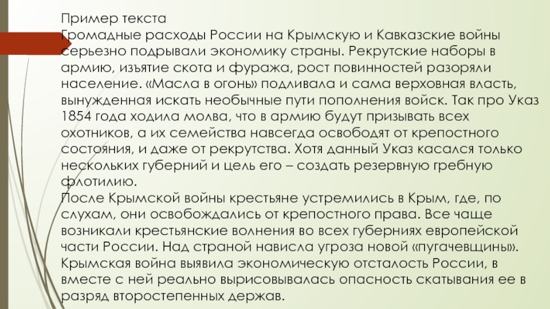 экономику страны. Рекрутские наборы в армию, изъятие скота и фуража, рост повинностей разоряли население. «Масла в огонь» подливала и сама верховная власть, вынужденная искать необычные пути пополнения войск. Так про Указ 1854 года ходила молва, что в армию будут призывать всех охотников, а их семейства навсегда освободят от крепостного состояния, и даже от рекрутства. Хотя данный Указ касался только нескольких губерний и цель его – создать резервную гребную флотилию.