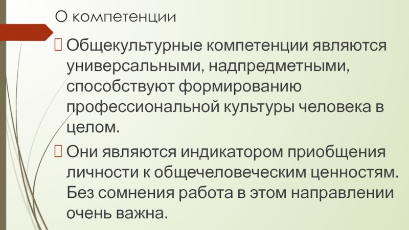 Общекультурные компетенции являются универсальными, надпредметными, способствуют формированию профессиональной культуры человека