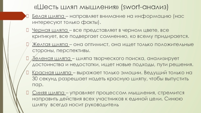 Слайд 13«Шесть шляп мышления» (swort-анализ)