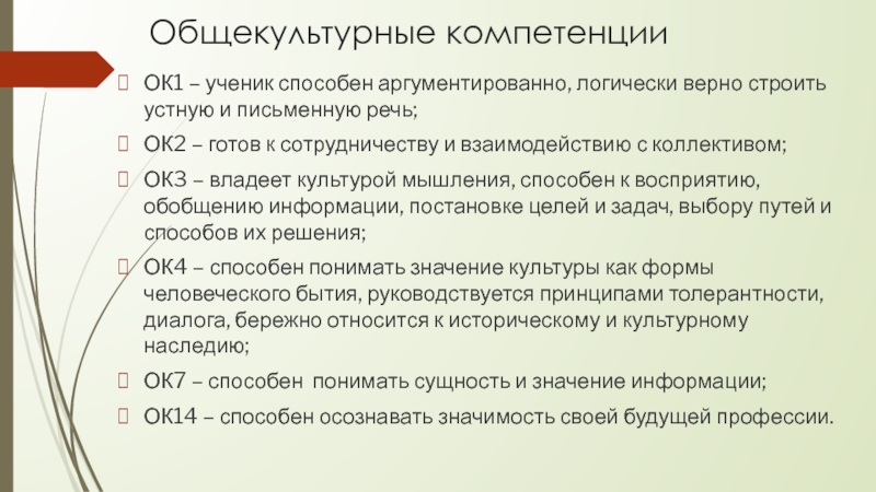 Будущий гражданин должен обладать такими общекультурными компетенциями как: