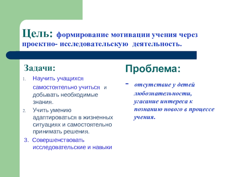 Слайд 2Цель: формирование мотивации учения через проектно- исследовательскую деятельность.