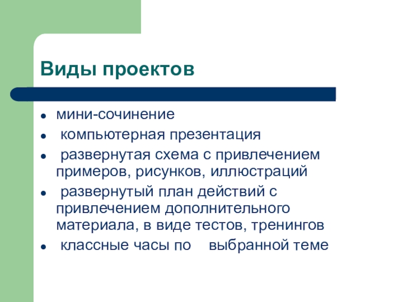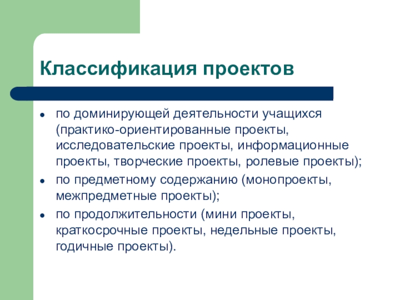 по продолжительности (мини проекты, краткосрочные проекты, недельные проекты, годичные проекты).