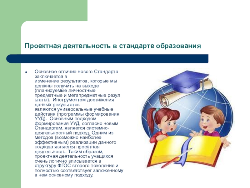 мы должны получить на выходе (планируемые личностные предметные и метапредметные результаты). Инструментом достижения данных результатов являются универсальные учебные действия (программы формирования УУД). Основным подходом формирования УУД, согласно новым Стандартам, является системно-деятельностный подход. Одним из методов (возможно наиболее эффективным) реализации данного подхода является проектная деятельность. Таким образом, проектная деятельность учащихся очень логично вписывается в структуру ФГОС второго поколения и полностью соответствует заложенному в нем основному подходу.