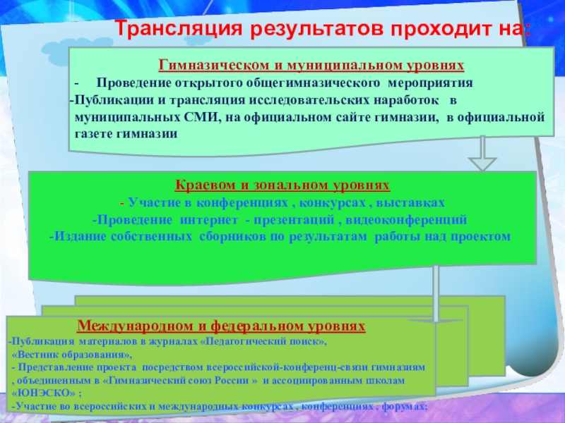 Публикации и трансляция исследовательских наработок в муниципальных СМИ, на официальном сайте гимназии, в официальной газете гимназии