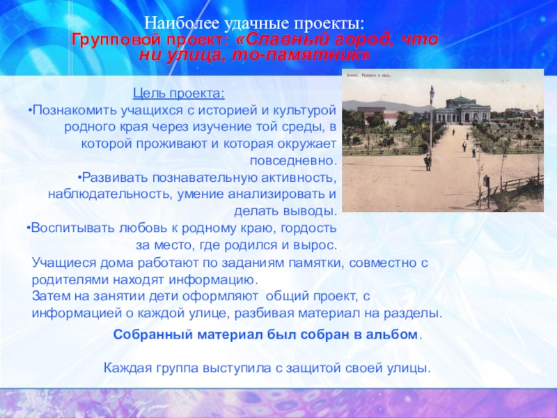 Затем на занятии дети оформляют общий проект, с информацией о каждой улице, разбивая материал на разделы.