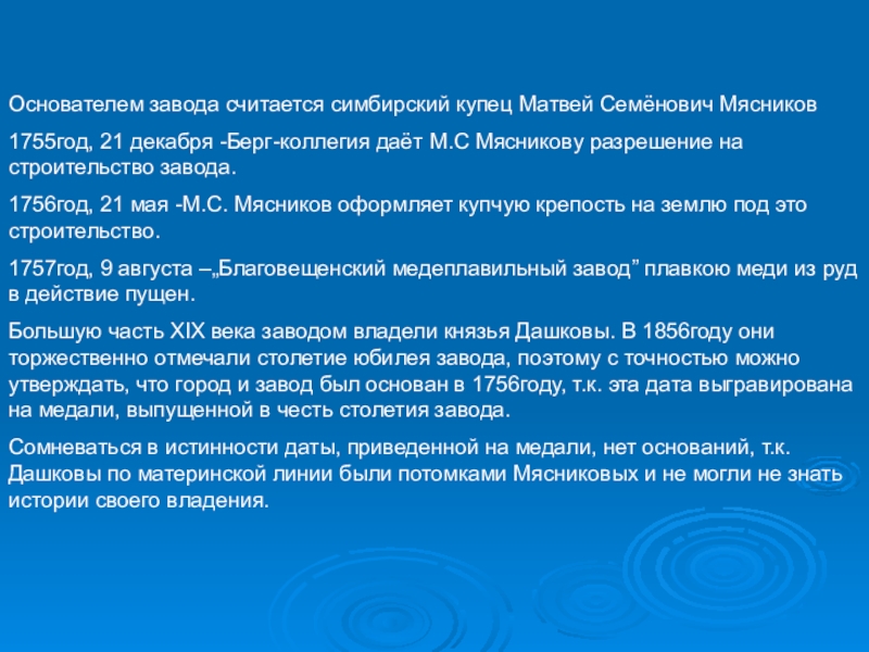 Слайд 4Основателем завода считается симбирский купец Матвей Семёнович Мясников