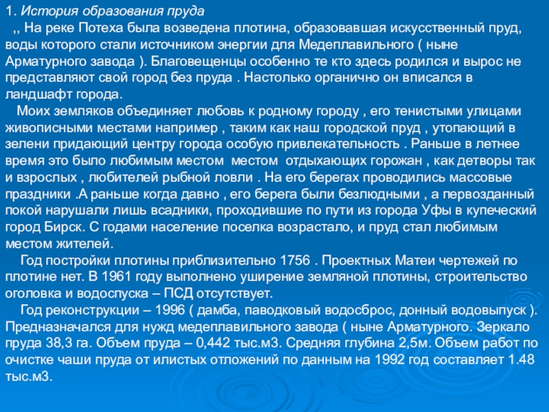 Моих земляков объединяет любовь к родному городу , его тенистыми улицами живописными местами например , таким как наш городской пруд , утопающий в зелени придающий центру города особую привлекательность . Раньше в летнее время это было любимым местом местом отдыхающих горожан , как детворы так и взрослых , любителей рыбной ловли . На его берегах проводились массовые праздники .А раньше когда давно , его берега были безлюдными , а первозданный покой нарушали лишь всадники, проходившие по пути из города Уфы в купеческий город Бирск. С годами население поселка возрастало, и пруд стал любимым местом жителей.
