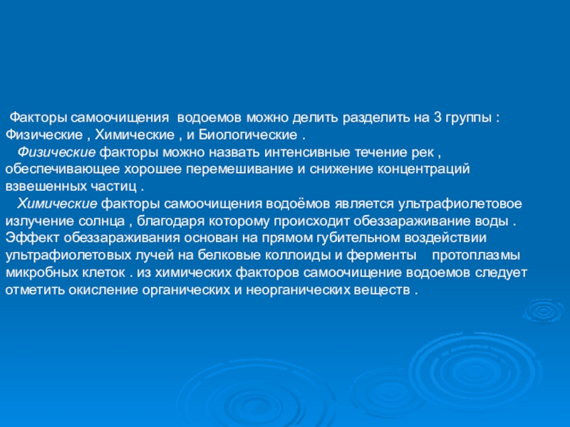 Слайд 5 Факторы самоочищения водоемов можно делить разделить на 3 группы :