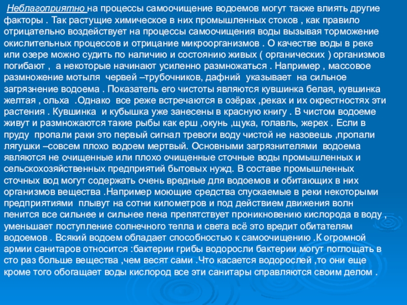 . Так растущие химическое в них промышленных стоков , как правило отрицательно воздействует на процессы самоочищения воды вызывая торможение окислительных процессов и отрицание микроорганизмов . О качестве воды в реке или озере можно судить по наличию и состоянию живых ( органических ) организмов погибают , а некоторые начинают усиленно размножаться . Например , массовое размножение мотыля червей –трубочников, дафний указывает на сильное загрязнение водоема . Показатель его чистоты являются кувшинка белая, кувшинка желтая , ольха .Однако все реже встречаются в озёрах ,реках и их окрестностях эти растения . Кувшинка и кубышка уже занесены в красную книгу . В чистом водоеме живут и размножаются такие рыбы как ерш ,окунь ,щука, голавль, жерех . Если в пруду пропали раки это первый сигнал тревоги воду чистой не назовешь ,пропали лягушки –совсем плохо водоем мертвый. Основными загрязнителями водоема являются не очищенные или плохо очищенные сточные воды промышленных и сельскохозяйственных предприятий бытовых нужд. В составе промышленных сточных вод могут содержать очень вредные для водоемов и обитающих в них организмов вещества .Например моющие средства спускаемые в реки некоторыми предприятиями плывут на сотни километров и под действием движения волн пенится все сильнее и сильнее пена препятствует проникновению кислорода в воду ,уменьшает поступление солнечного тепла и света всё это вредит обитателям водоемов . Всякий водоем обладает способностью к самоочищению .К огромной армии санитаров относится :бактерии грибы водоросли бактерии могут поглощать в сто раз больше вещества ,чем весят сами .Что касается водорослей ,то они еще кроме того обогащает воды кислород все эти санитары справляются своим делом .