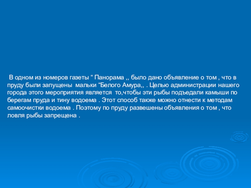 объявление о том , что в пруду были запущены мальки “Белого Амура,, . Целью администрации нашего города этого мероприятия является то,чтобы эти рыбы подъедали камыши по берегам пруда и тину водоема . Этот способ также можно отнести к методам самоочистки водоема . Поэтому по пруду развешены объявления о том , что ловля рыбы запрещена .