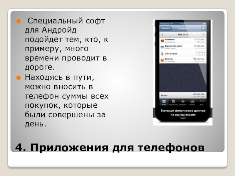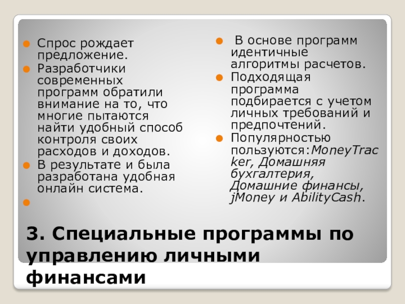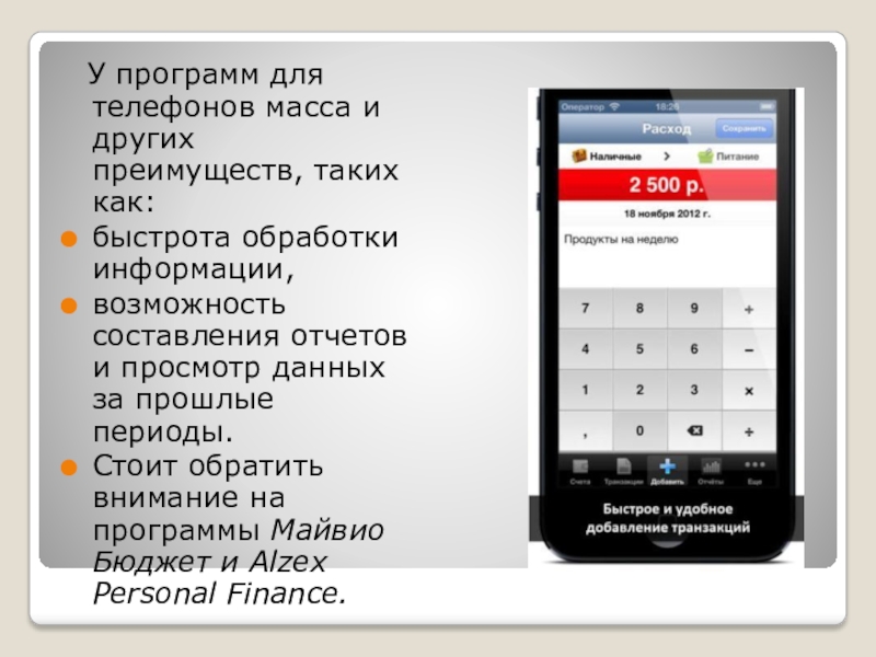 Популярностью пользуются:MoneyTracker, Домашняя бухгалтерия, Домашние финансы, jMoney и AbilityCash.