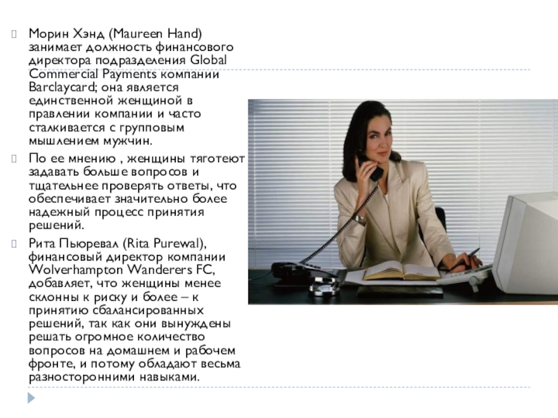 Слайд 10Морин Хэнд (Maureen Hand) занимает должность финансового директора подразделения Global Commercial