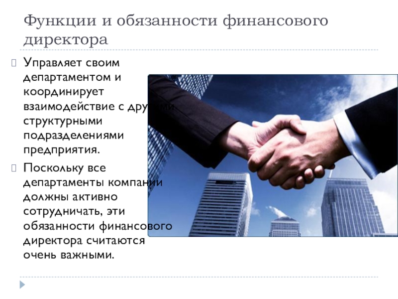 Поскольку все департаменты компании должны активно сотрудничать, эти обязанности финансового директора считаются очень важными.