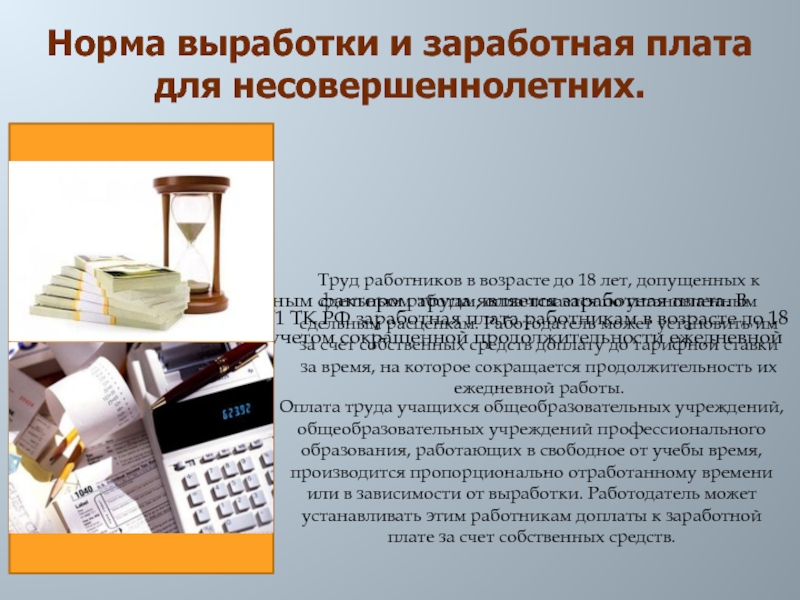 Слайд 22Норма выработки и заработная плата для несовершеннолетних.
