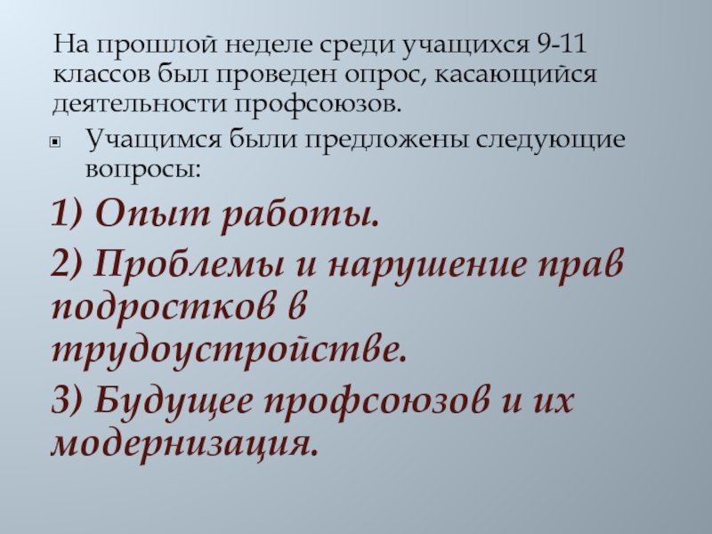 Тема: «Профсоюзы: прошлое, настоящее и будущее»