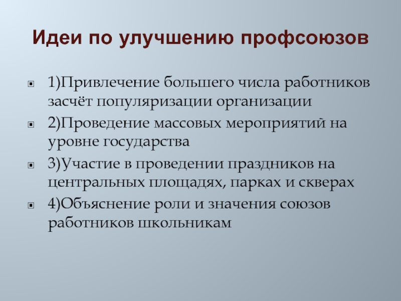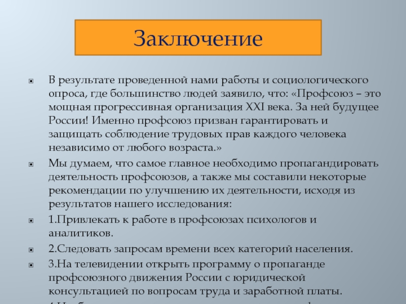 Мы думаем, что самое главное необходимо пропагандировать деятельность профсоюзов, а также мы составили некоторые рекомендации по улучшению их деятельности, исходя из результатов нашего исследования: