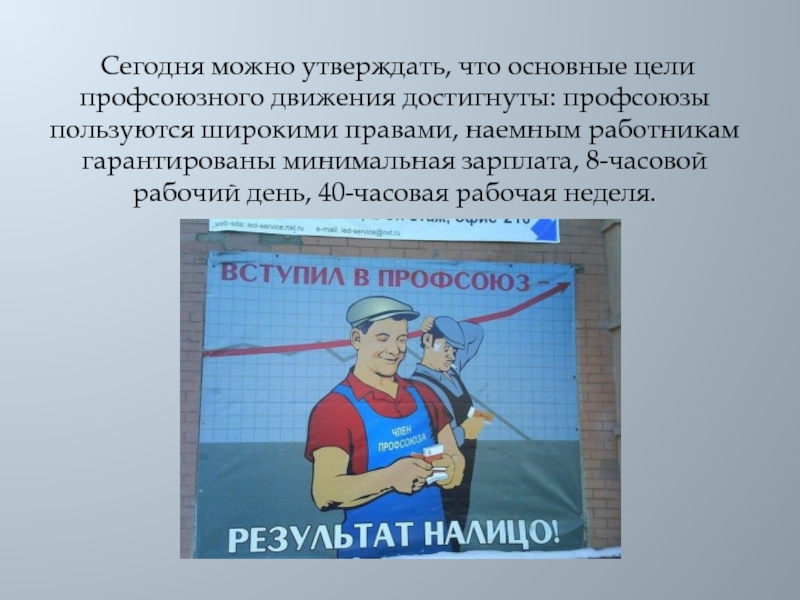 Слайд 12 Сегодня можно утверждать, что основные цели профсоюзного движения достигнуты: профсоюзы