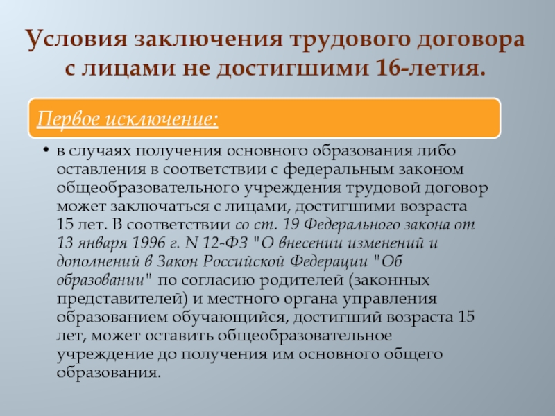 Слайд 17Условия заключения трудового договора с лицами не достигшими 16-летия.