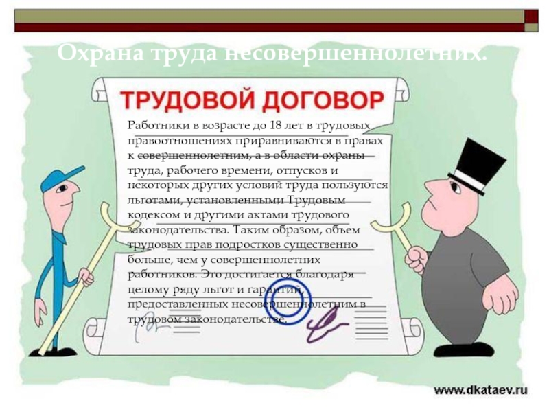 приравниваются в правах к совершеннолетним, а в области охраны труда, рабочего времени, отпусков и некоторых других условий труда пользуются льготами, установленными Трудовым кодексом и другими актами трудового законодательства. Таким образом, объем трудовых прав подростков существенно больше, чем у совершеннолетних работников. Это достигается благодаря целому ряду льгот и гарантий, предоставленных несовершеннолетним в трудовом законодательстве.