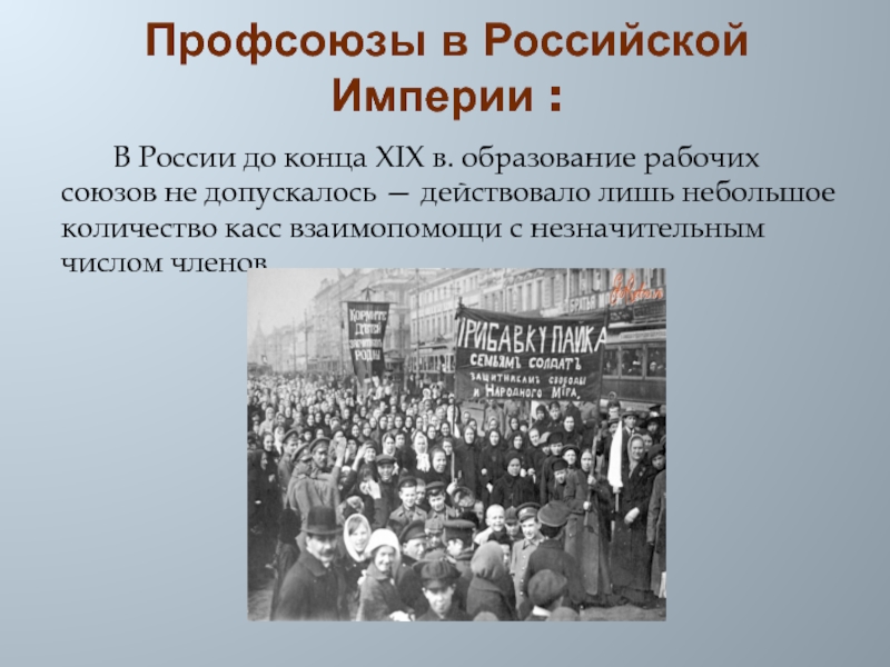 конца XIX в. образование рабочих союзов не допускалось — действовало лишь небольшое количество касс взаимопомощи с незначительным числом членов.