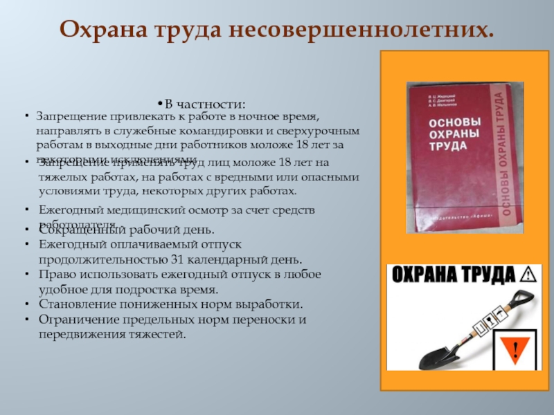 Запрещение привлекать к работе в ночное время, направлять в служебные командировки и сверхурочным работам в выходные дни работников моложе 18 лет за некоторыми исключениями.