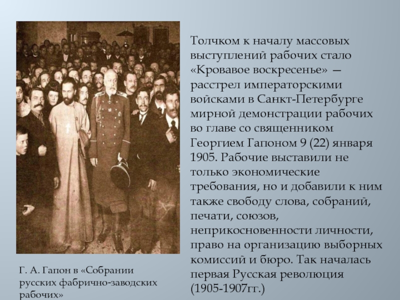 императорскими войсками в Санкт-Петербурге мирной демонстрации рабочих во главе со священником Георгием Гапоном 9 (22) января 1905. Рабочие выставили не только экономические требования, но и добавили к ним также свободу слова, собраний, печати, союзов, неприкосновенности личности, право на организацию выборных комиссий и бюро. Так началась первая Русская революция (1905-1907гг.)